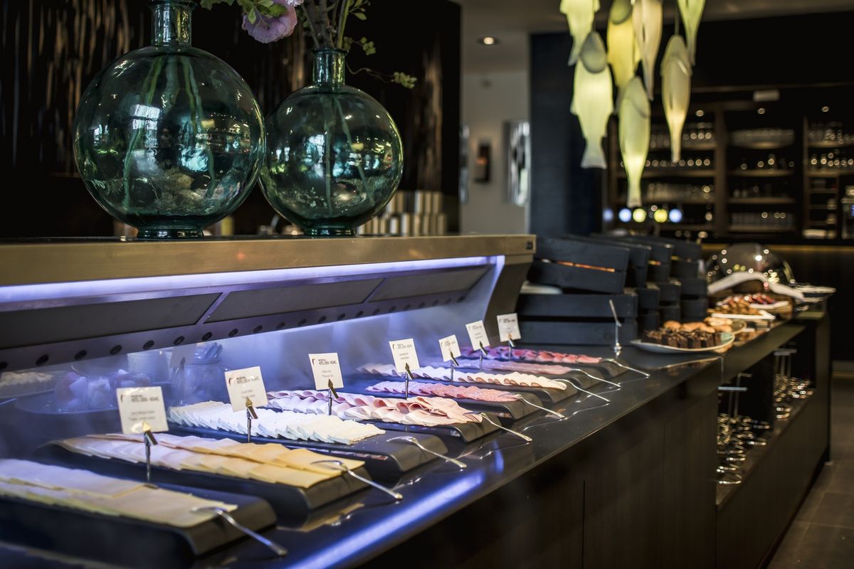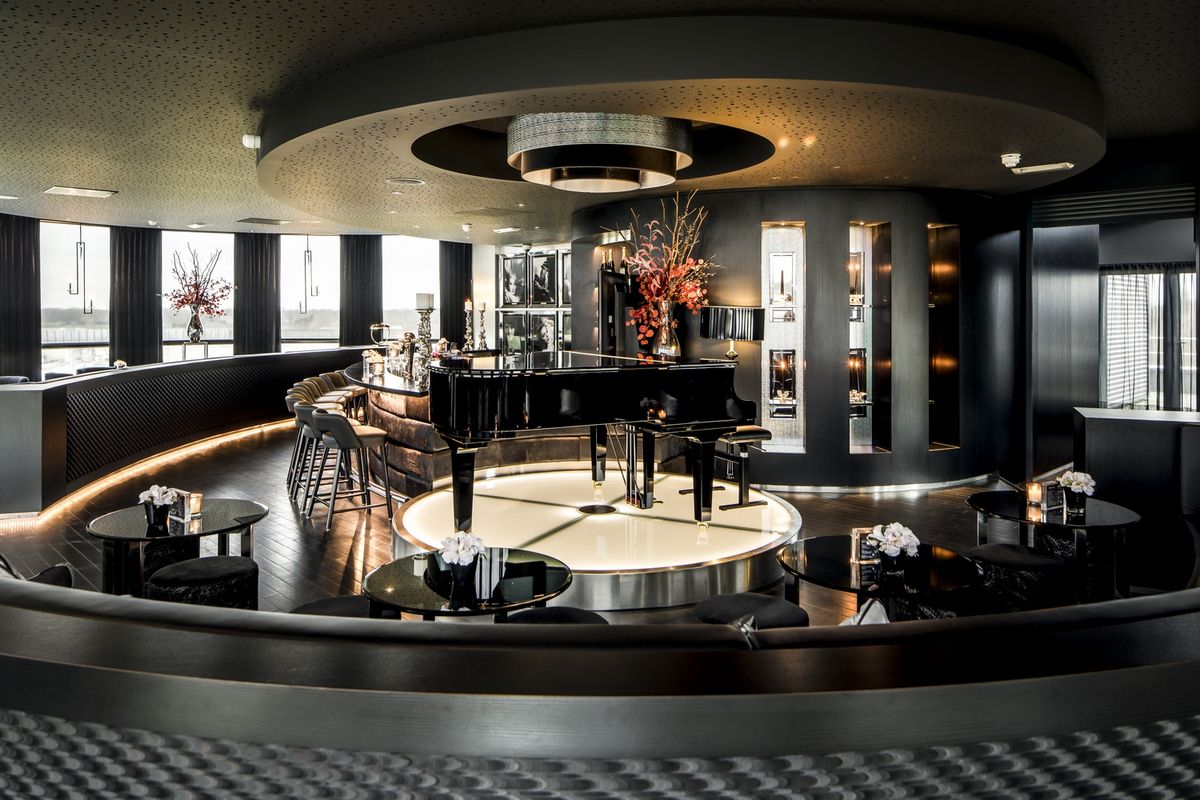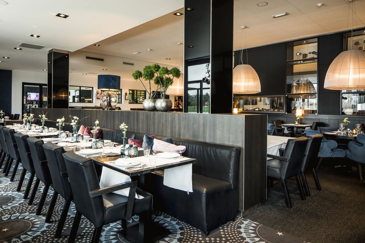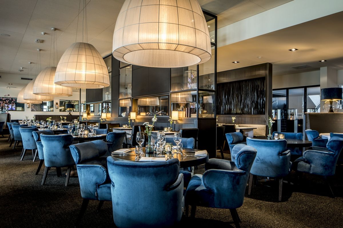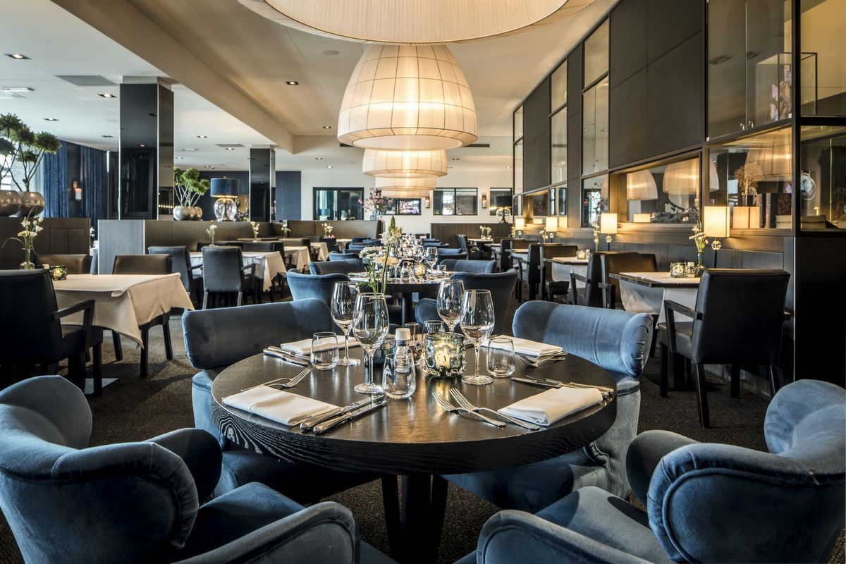 De receptie/lobby, de Brasserie, het Restaurant, het zalencentrum met de verschillende break-outs en tenslotte de Skybar.