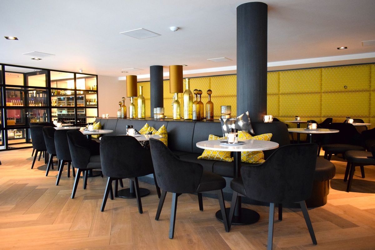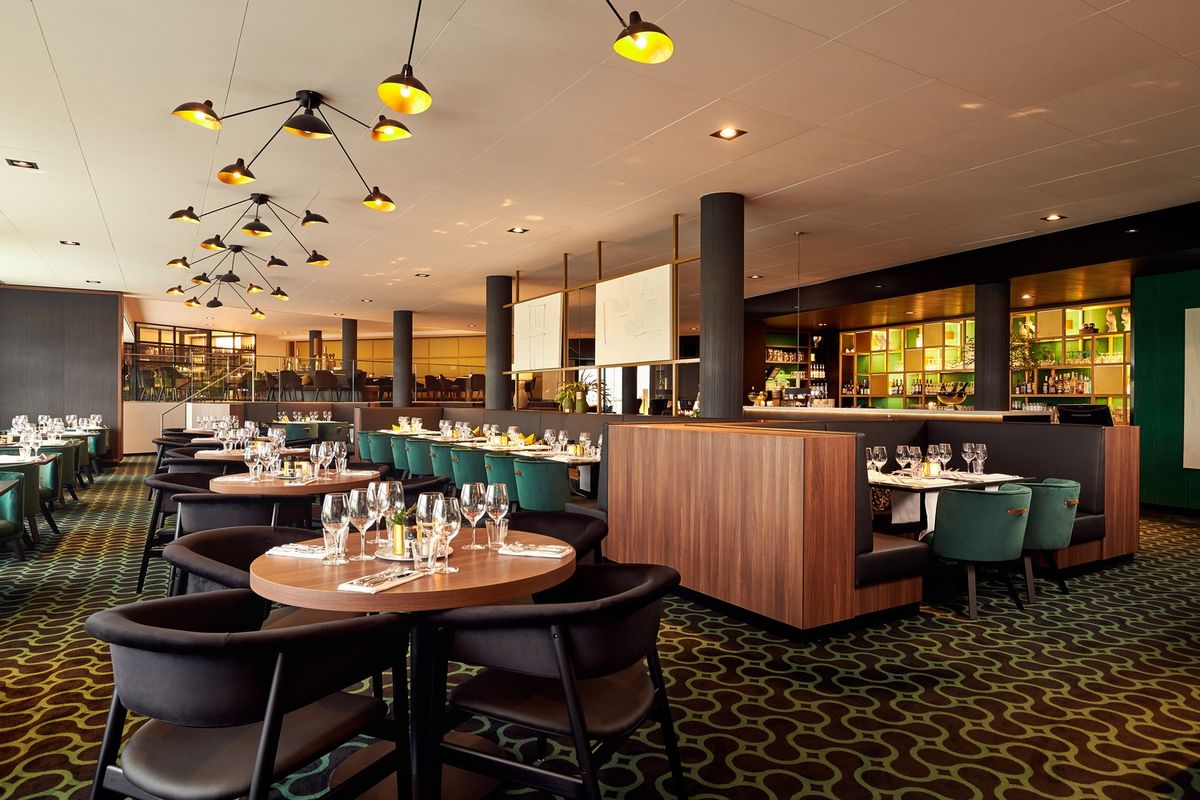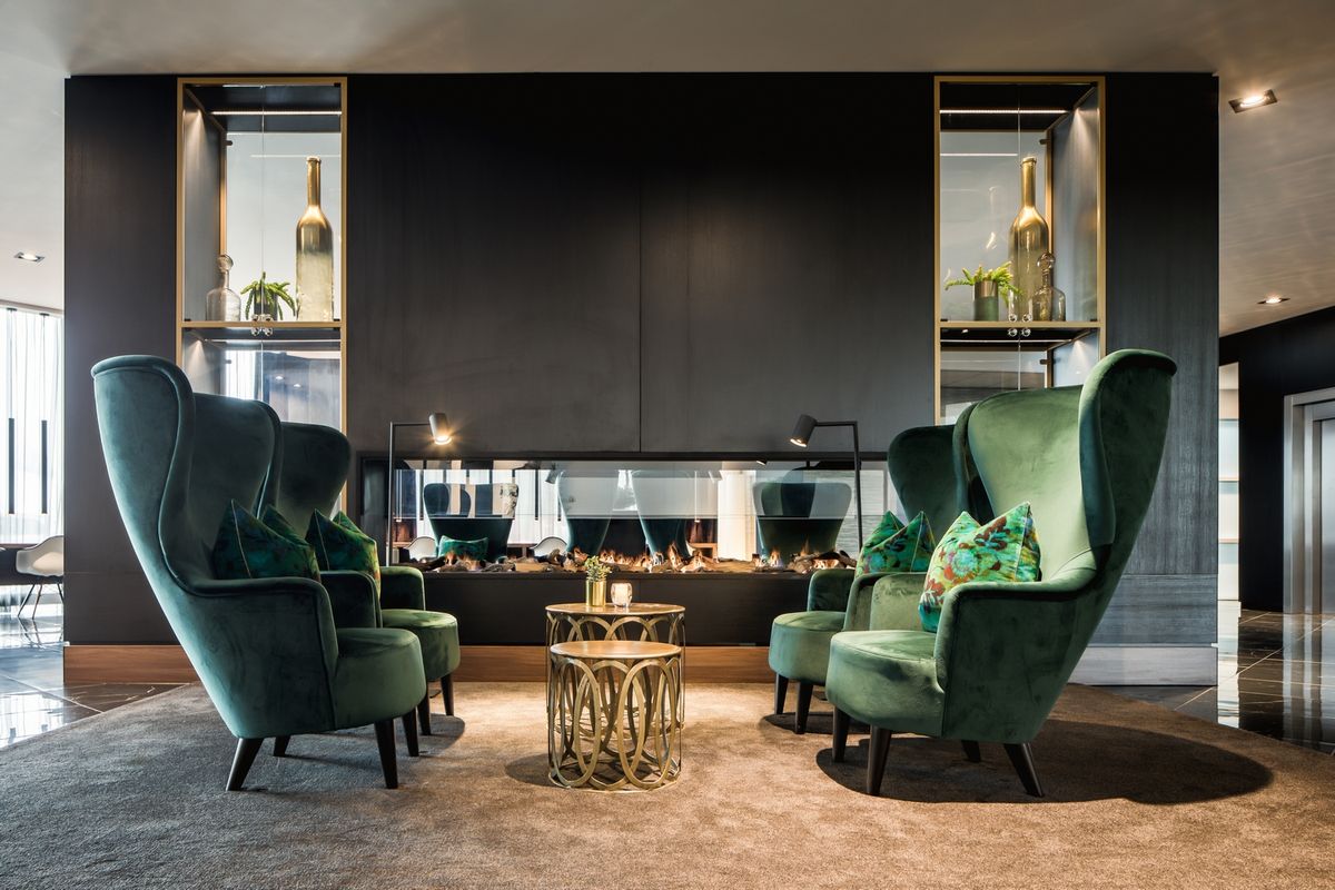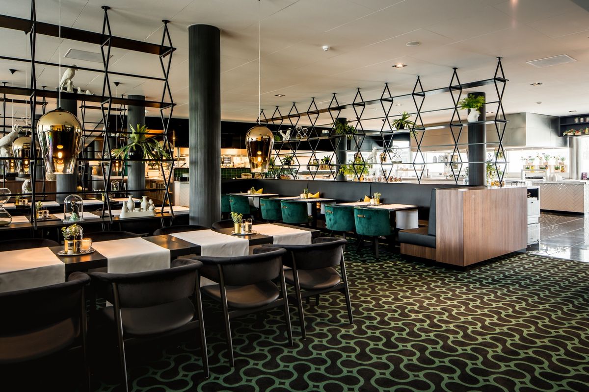 De inrichting heeft een mooie warme, chique sfeer met veel groenen en goud kleuren.
